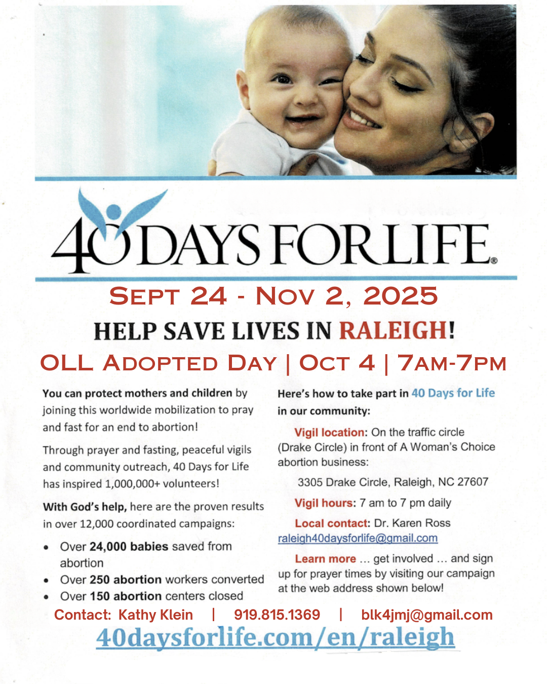 Activities include a Pro-Life Rosary each Tuesday evening at 6:00 p.m. in the Holy Family Adoration chapel, on Sundays at 8:30 a.m. in the Holy Family Adoration chapel, and before the 11:30 a.m. Mass on Sunday in the church, as well as participation in deanery-wide and national pro-life activities.